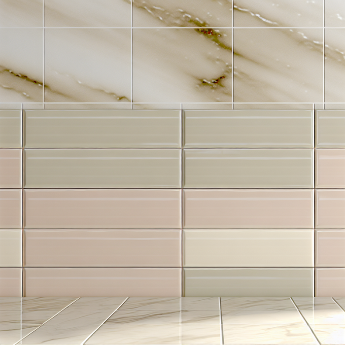 У Grazia богатая палитра форм: компактные прямоугольники 6,5×13 см для раскладки «кабанчик», квадраты 10×10 и 20×20 см, октагоны со вставками. Встречаются элементы со скошенной фаской (bevel), завершающие планки и бордюры — ими удобно аккуратно «закрывать» торцы и проёмы. По фактуре — от зеркально-глянцевой до мягко-матовой; есть деликатные волны и рельефы, которые ловят свет и оживляют плоскость. В маленьких помещениях рельеф используйте порционно — одна акцентная полоса работает лучше, чем «шум» по всей стене.